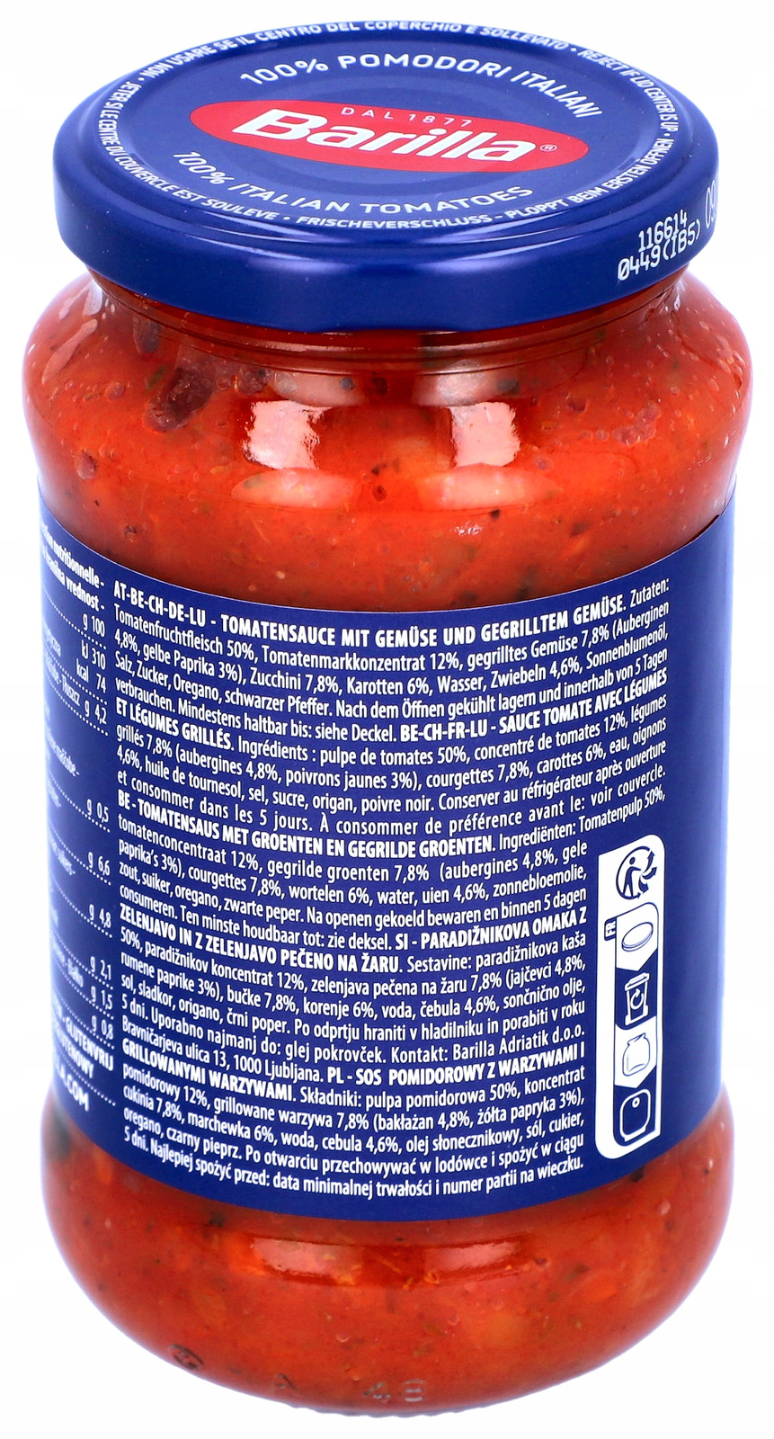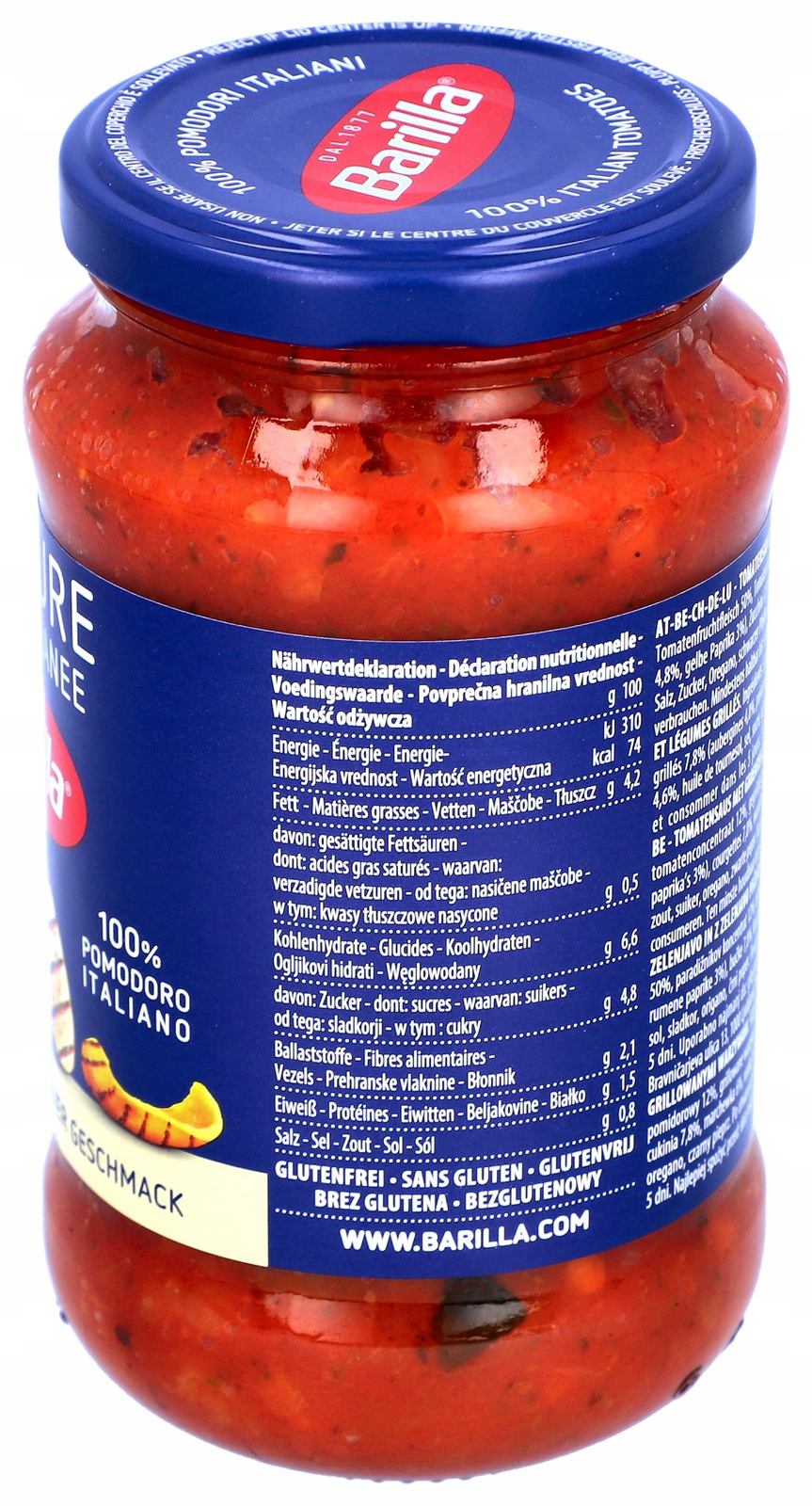 pulpa pomidorowa 50%,koncentrat pomidorowy 12%,grillowane warzywa 7,8 %, ( bakłażan 4,8 %, zółta papryka 3 % )cukinia 7,8 %,marchewka 6 %,woda,cebula 4,6 %,olej słonecznikowy,sól,cukier,oregano,czarny pieprz