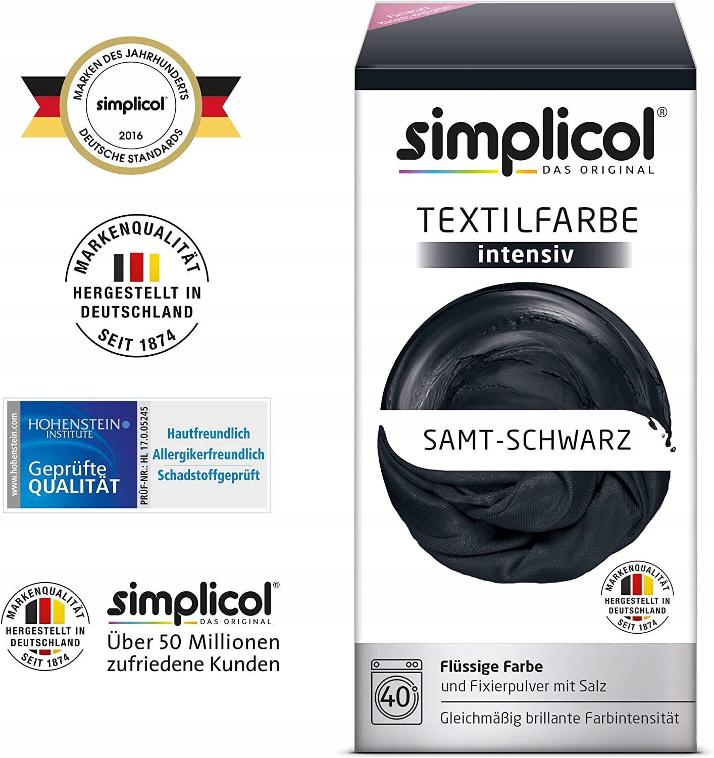 Barwnik do tkanin czarnych Simplicol zapewnia intensywny czarny kolor już po pierwszym farbowaniu. Wysokiej jakości niemiecki barwnik do tkanin Simplicol umożliwia proste i szybkie farbowanie w pralce. Innowacyjny barwnik w płynie działa natychmiast intensywnie oraz równomiernie farbując tkaniny. Idealny do farbowania i odświeżania kolorów.