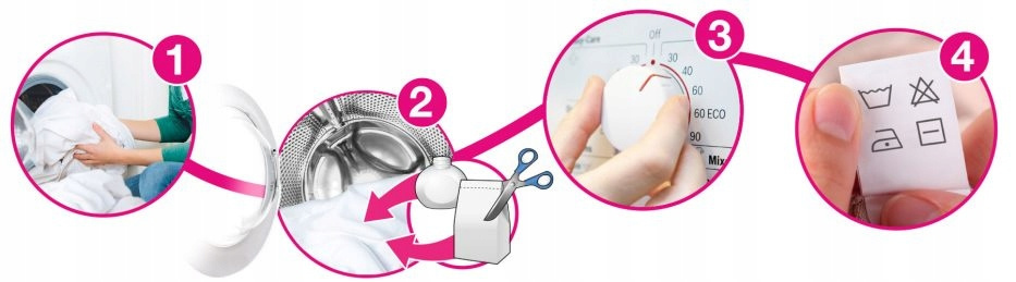 - Zabarwione tekstylia wyprać powtórnie w pralce zgodnie z zaleceniami producenta tkaniny (patrz metka) z dodatkiem proszku do prania.