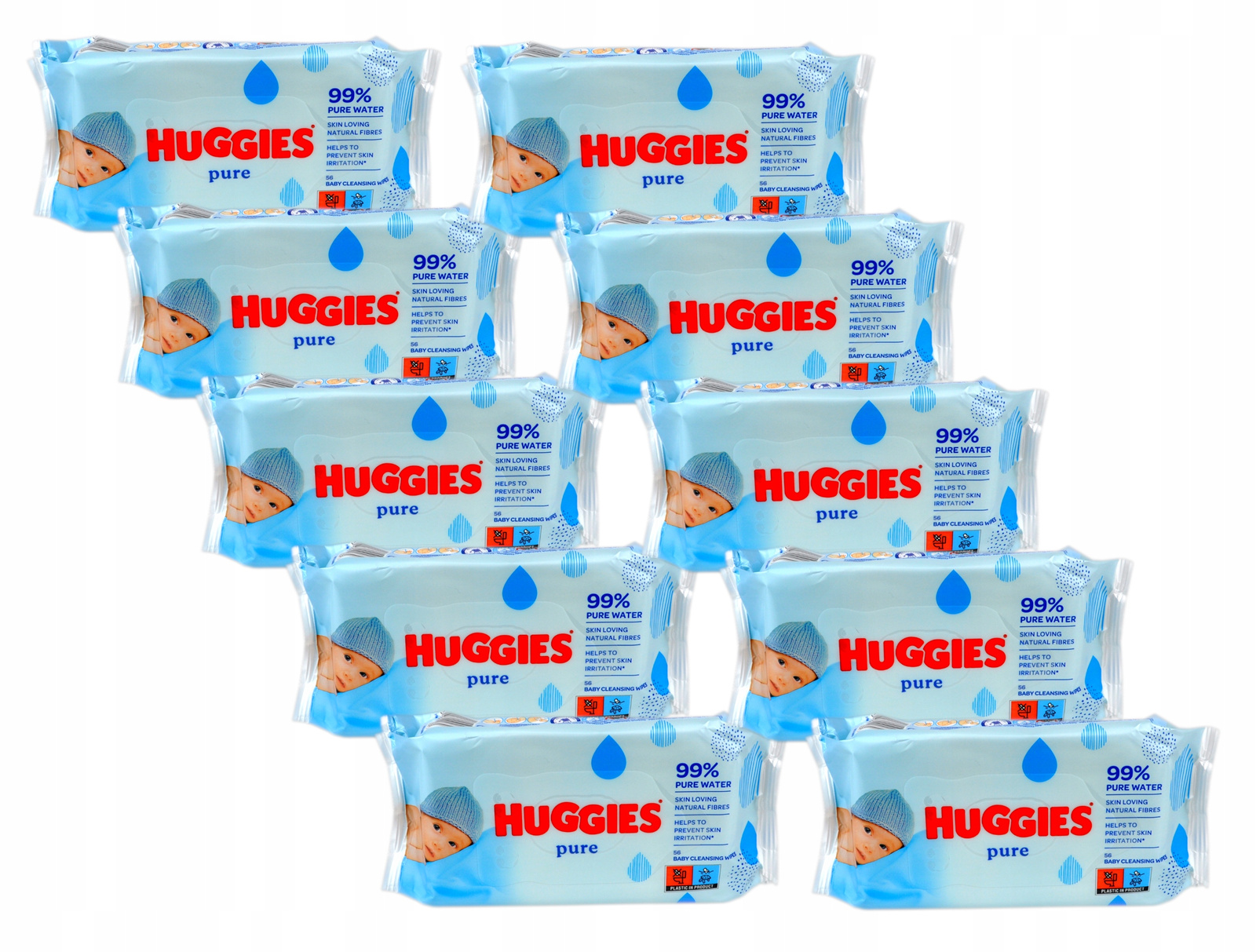 Chusteczki nawilżane HUGGIES Pure 10szt wygodnych opakowań po 56 szt w każdym, razem 560 chusteczek.