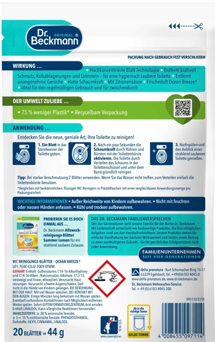 Dzięki listkom do czyszczenia toalet Ocean Breeze firmy Dr. Beckmann nie tylko oszczędza plastik, ale także sprawia, że toaleta będzie lśniąca bielą. Listki są w 100% rozpuszczalne w wodzie i wyjątkowo skutecznie usuwają brud i kamień.