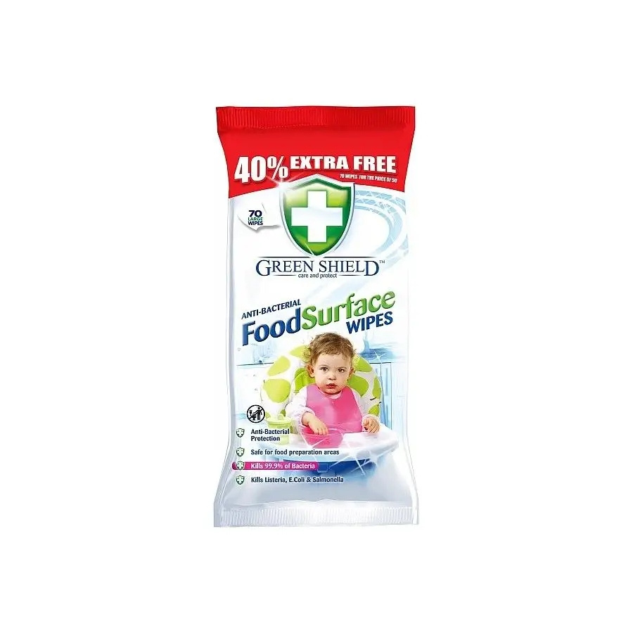Chusteczki kosmetyczne, antybakteryjne Green Shield Anti-Bacterial Food Surface do czyszczenia wszystkich powierzchni w obrębie których przygotowywane jest jedzenie.