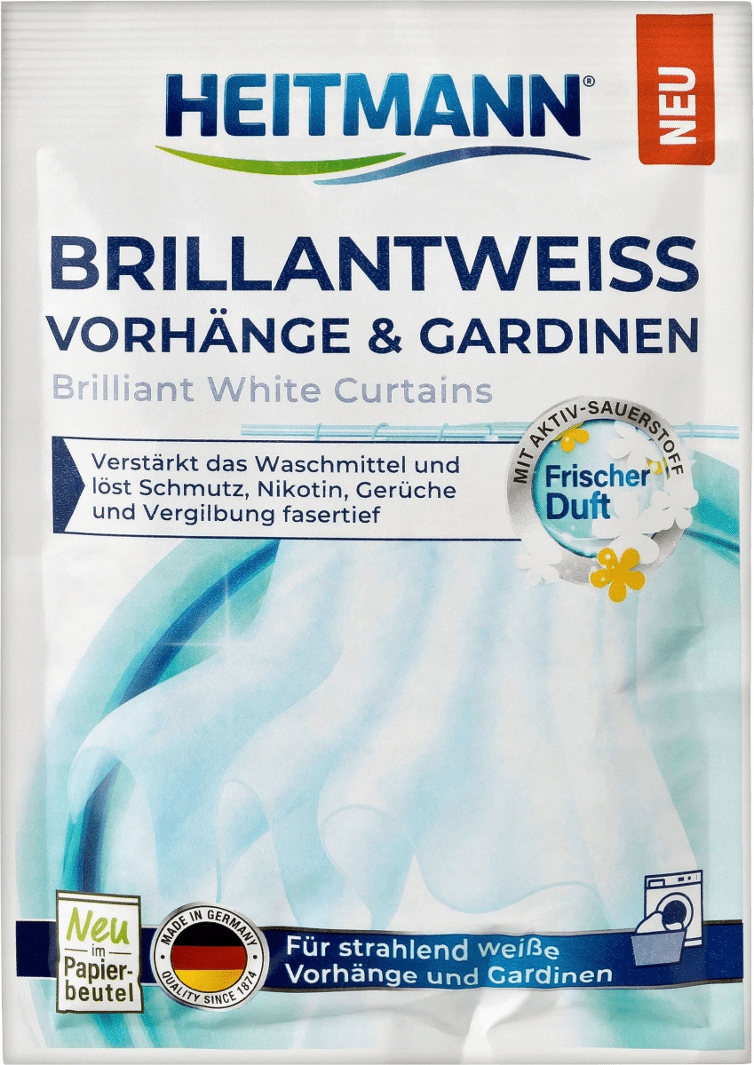 Dzięki detergentowi HEITMANN o brylantowej bieli do firan możesz uzupełnić swój normalny środek piorący i uczynić go jeszcze silniejszym. W ten sposób z łatwością usuniesz brud, szarą mgiełkę, żółknięcie, nikotynę i zapachy z zasłon i to już od 30°C.