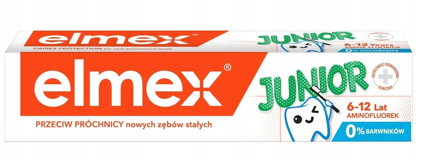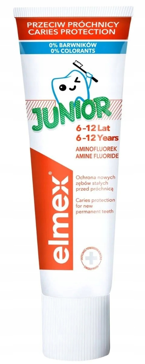 ELMEX JUNIOR PASTA DO ZĘBÓW DLA DZIECI 6-12 LAT PRZECIW PRÓCHNICY ZĘBÓW STAŁYCH AMINOFLUOREK 0% BARWNIKÓW 75ml